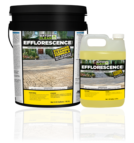 GATOR EFFLORESCENCE CLEANER will remove any efflorescence stains trapped in the concrete pavers and natural stone pores. It will make the pavers look more clean and vibrant. This efflorescence cleaning is a necessary step before a sealer is applied. The sealer will be able to get a deeper penetration into the now clean pores.